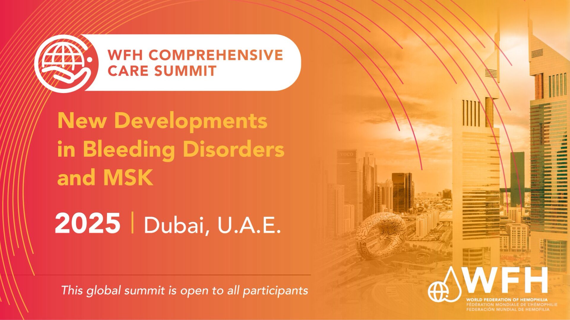 During the opening ceremony today, the location of the WFH 2025 Comprehensive Care Summit was announced. We are happy to share with you that the next summit will take place in Dubai, U.A.E. next year.