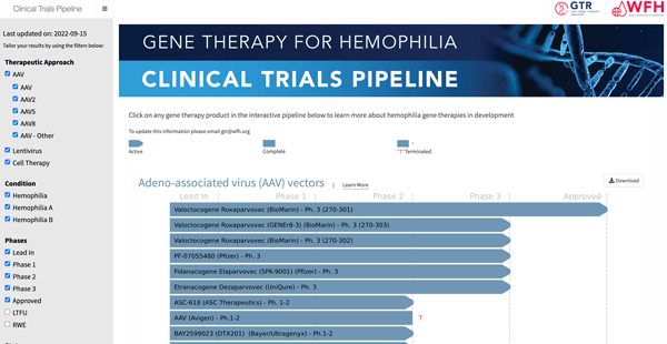 The new clinical trials education page includes general information, such as why clinical trials are needed, how they are conducted, and how to participate in one. The page also includes downloadable documents, such as “Questions to ask before participating in a clinical trial”. The WFH Gene Therapy for Hemophilia Clinical Trials Pipeline Tool is a new way to view all ongoing gene therapy clinical trials. It allows users to search based on therapeutic approach, clinical trial phase, and more.