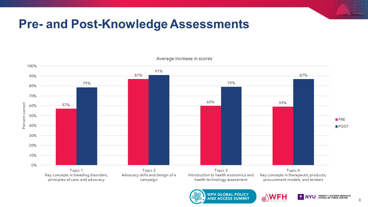 Over a period of eight months, PACT Advocacy Academy participants completed four modules co-created by the WFH and New York University – Robert F. Wagner Graduate School of Public Service. The modules covered key concepts in bleeding disorders, principles of care, and advocacy; advocacy skills and campaign design; introduction to health economics and health technology assessments; and key concepts in therapeutic products, procurement models, and tenders. Participants also developed real-life advocacy campaigns through a series of practical assignments. The instructors and mentors, who included advocacy and bleeding disorders experts, trained and advised the students through the lens of advocating for safe and sustainable treatment and care—a key strategic objective of the WFH.