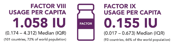 The median factor VIII and factor IX use per capita were calculated to be 1.058 and 0.155 IU respectively.