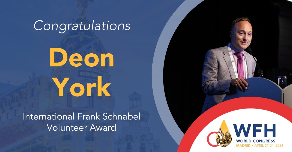 ![]() | International Frank Schnabel Volunteer Award Former WFH Board member and Chair of the Youth Committee, Deon York, received the International Frank Schnabel Volunteer Award in recognition of his global contributions to training and advocacy work. Deon York has been involved with the New Zealand NMO since the late nineties, holding many board-level positions, and currently serving as their Board Chair. He has contributed to the WFH through the WFH Congress Multidisciplinary Committee, played a key role in developing the Global NMO Training program, and currently mentors in the PACT Advocacy Academy and supports the Fiji NMO through the HOT Twinning Program. |