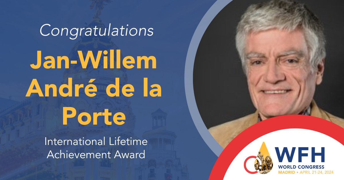 ![]() | International Lifetime Achievement Award Jan Willem Andre de la Porte—a former WFH Patron—was presented with the International Lifetime Achievement Award, honouring his exemplary leadership, compassion, and commitment to youth within the bleeding disorders community. Jan Willem Andre de la Porte first became involved with the WFH in 1994 and led the fundraising committee for many years. At WFH Congresses, he has mentored numerous youth fellows, sharing his experiences and offering invaluable guidance. With an international background spanning the Netherlands, South Africa, and now Belgium, his advocacy efforts are informed by a unique perspective. |