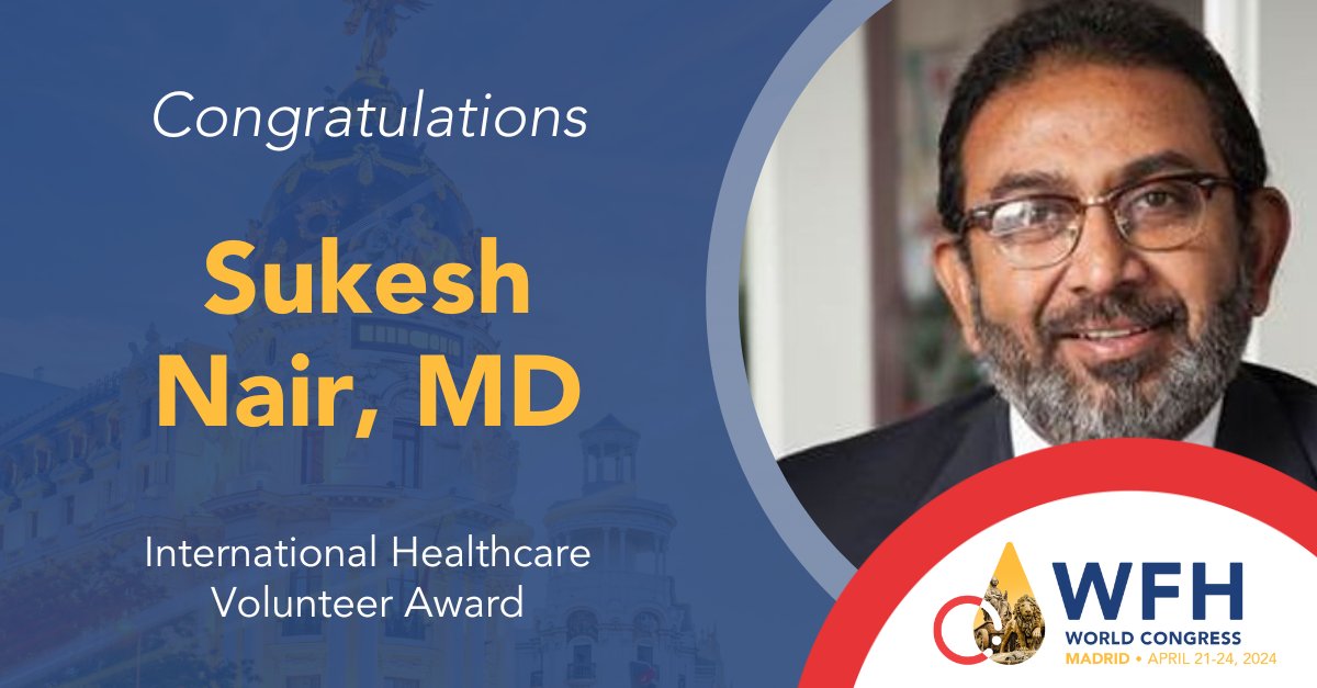 ![]() | WFH International Healthcare Volunteer Award Sukesh Nair, MD, former chair of the WFH Lab Sciences Committee, was awarded the WFH International Healthcare Volunteer Award for his commitment to patient care, education, global healthcare enhancement and external quality control. As a strong advocate of external quality control, Sukesh Nair’s leadership as Chair of the International External Quality Assessment Scheme (IEQAS) committee has helped enhance the program’s success. His support has been instrumental in establishing IEQAS in the Philippines, China, Thailand, Sri Lanka, Egypt and South Africa. As Vice Chair—and, later, Chair of the Lab Sciences committee—he contributed to the success of IEQAS during a period where diagnosis became an increasingly important focus for the WFH. |