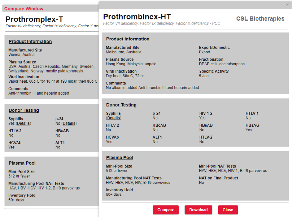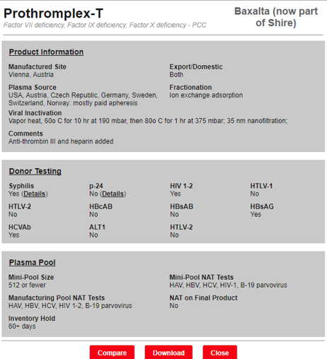 Users of the Online CFC Registry can learn more about specific products by selecting the “Details” button. This opens a pop-up window containing information on how and where the product is manufactured. For products derived from plasma, details of donor testing protocols and the plasma pool are also listed. Clicking on the “Download” button allows users to download a PDF of a particular product for offline reading.