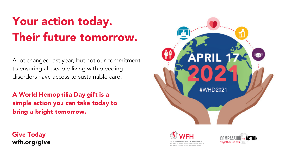 - I turned my compassion to action. Join me on #WorldHemophiliaDay and support the work of the WFH. wfh.org/give [see below for an image that can be used with this example]