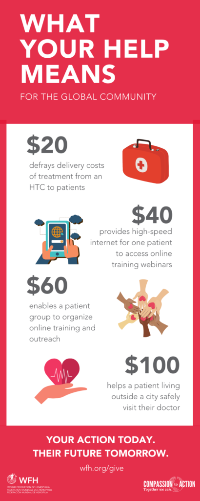 This World Hemophilia Day, you can help! Take action by making a donation to help us continue to help us meet the needs of the global bleeding disorders community.