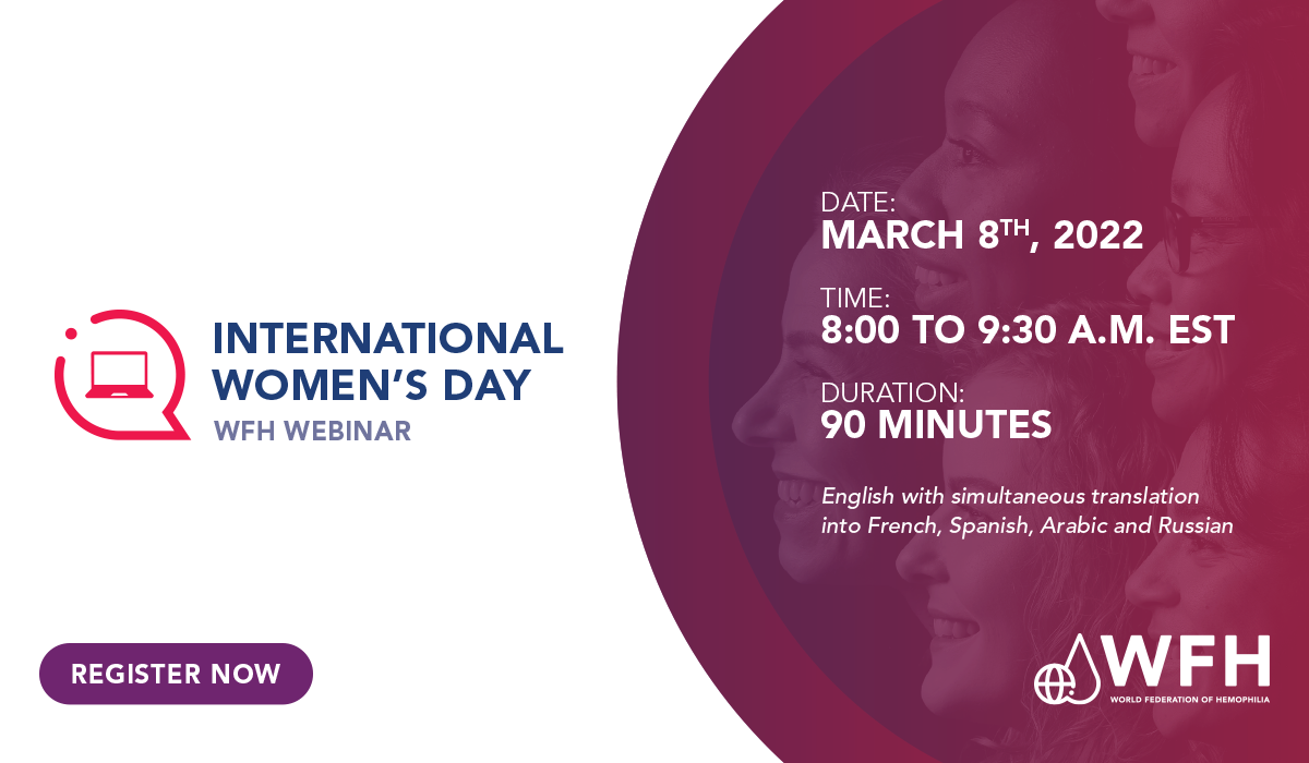 Tuesday, March 8, is International Women’s Day (IWD), a global event that celebrates the achievements of women around the world. This year, the World Federation of Hemophilia (WFH) will honour IWD with a webinar which will take place from 8 a.m. to 9:30 a.m. Eastern Standard Time (EST).