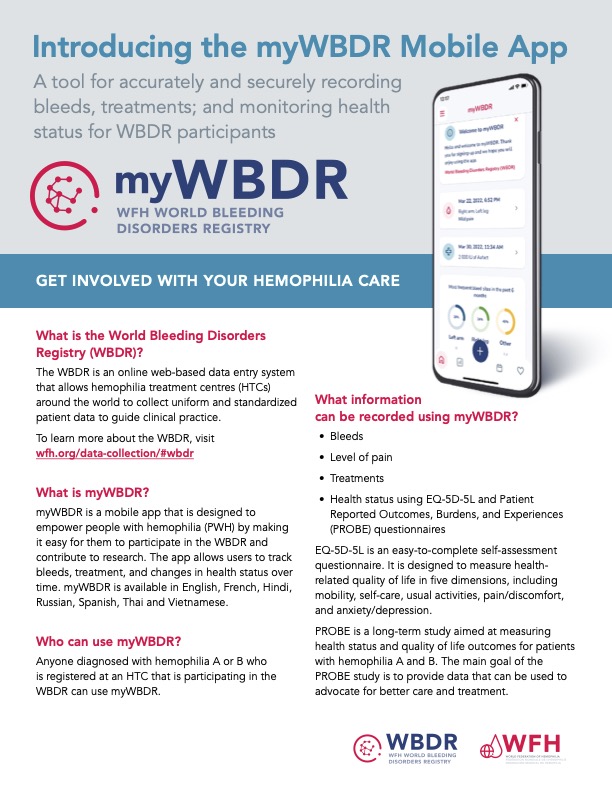 As the WBDR grows, more features and improvements are being introduced to the platform. At the WFH 2022 World Congress, the WFH launched myWBDR, a new patient mobile app which offers a health monitoring tool and a diary for PWH, and patient-reported outcome data for researchers and clinicians. The app is available in seven languages.