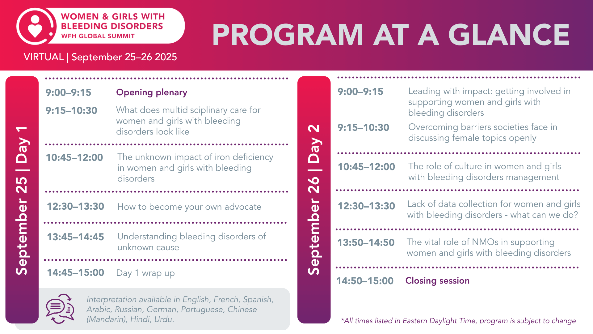 The WFH is pleased to announce that the fourth WFH Global Summit on Women and Girls with Bleeding Disorders (WGBD) will be held virtually on September 25 and 26, 2025 from 9:00 a.m. to 3:00 p.m. (EDT). This edition will include educational sessions targeted to people with bleeding disorders, their families and national member organization (NMO) advocates. It also offers sessions targeted to healthcare providers and other stakeholders.